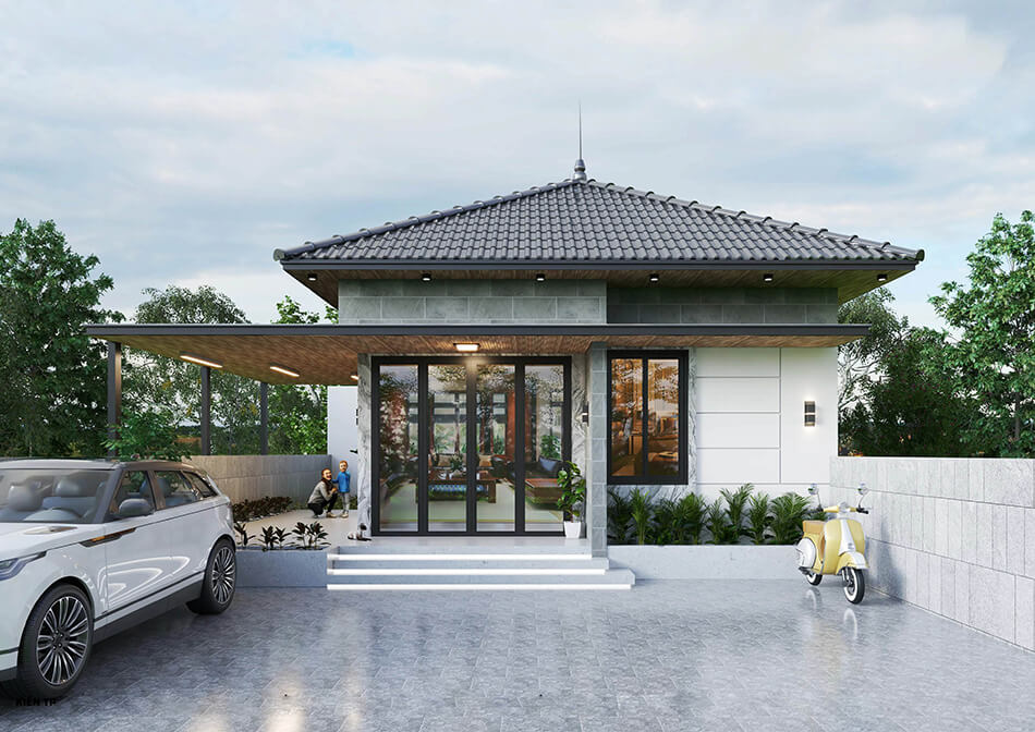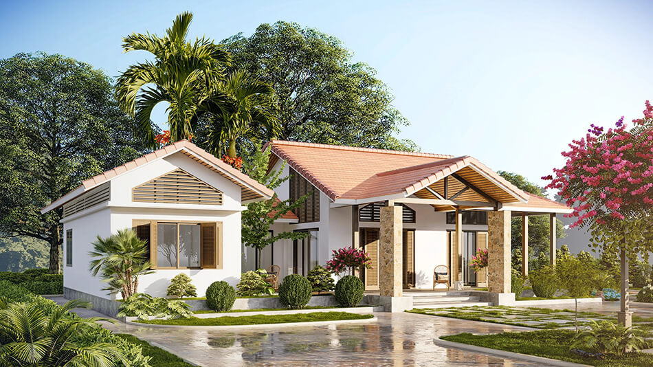 Mẫu thiết kế này có kiến trúc thấp tầng, thích ứng tốt với điều kiện thời tiết nhiệt đới gió mùa. Những chi tiết như mái hiên rộng, gạch thông gió hay khoảng sân mở giúp ngôi nhà luôn mát mẻ và thông thoáng. Vật liệu mái thường được lựa chọn kỹ lưỡng nhằm chống thấm, cách nhiệt hiệu quả.